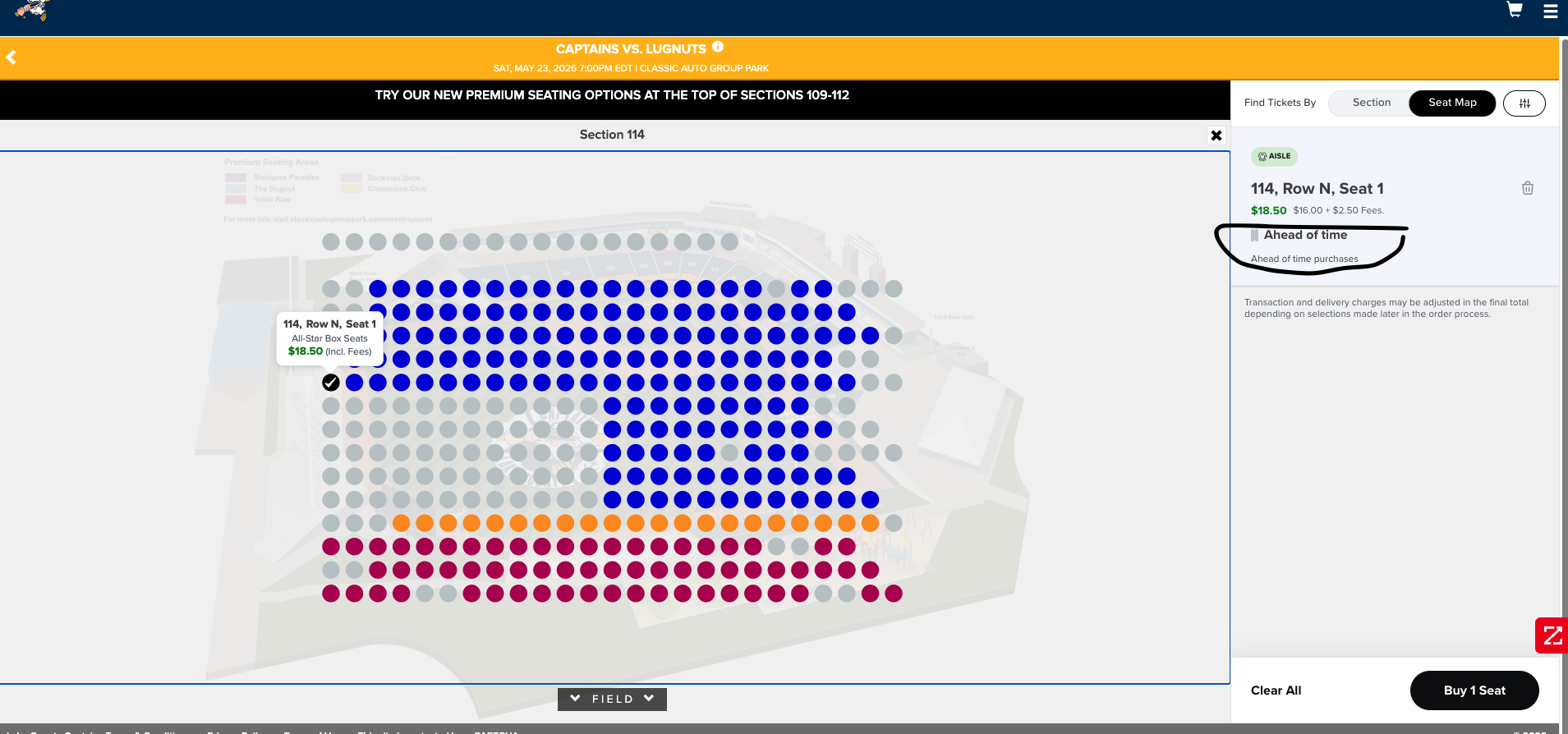 3) Click on a seat to add one ticket to your cart.
